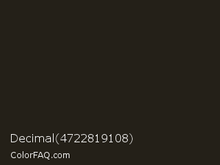Decimal 4722819108 Color is a very dark orange color and the nearest color is Oil #281e15. Hex code #242018 and RGB value is rgb(36,32,24). In RGB color space, this color is composed of 14% red, 13% green, 9% blue, In CMYK color space, this color is composed of 0% cyan, 11% magenta, 33% yellow , 86% black , In HSL color space, this color has a hue angle of 40° , 20% saturation and 12% lightness.