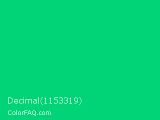 Decimal 1153319 Color is a normal green color and the nearest color is Caribbean Green #00cc99. Hex code #01d477 and RGB value is rgb(1,212,119). In RGB color space, this color is composed of 0% red, 83% green, 47% blue, In CMYK color space, this color is composed of 100% cyan, 0% magenta, 44% yellow , 17% black , In HSL color space, this color has a hue angle of 154° , 99% saturation and 42% lightness.