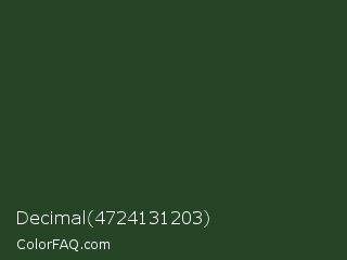 Decimal 4724131203 Color is a very dark green color and the nearest color is Cal Poly Pomona Green #1e4d2b. Hex code #264527 and RGB value is rgb(38,69,39). In RGB color space, this color is composed of 15% red, 27% green, 15% blue, In CMYK color space, this color is composed of 45% cyan, 0% magenta, 43% yellow , 73% black , In HSL color space, this color has a hue angle of 122° , 29% saturation and 21% lightness.