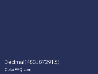Decimal 4831872915 Color is a dark blue color and the nearest color is Cloud Burst #202e54. Hex code #273059 and RGB value is rgb(39,48,89). In RGB color space, this color is composed of 15% red, 19% green, 35% blue, In CMYK color space, this color is composed of 56% cyan, 46% magenta, 0% yellow , 65% black , In HSL color space, this color has a hue angle of 229° , 39% saturation and 25% lightness.