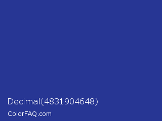 Decimal 4831904648 Color is a normal blue color and the nearest color is Blue Pigment #333399. Hex code #273694 and RGB value is rgb(39,54,148). In RGB color space, this color is composed of 15% red, 21% green, 58% blue, In CMYK color space, this color is composed of 74% cyan, 64% magenta, 0% yellow , 42% black , In HSL color space, this color has a hue angle of 232° , 58% saturation and 37% lightness.