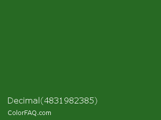 Decimal 4831982385 Color is a dark green color and the nearest color is Mughal Green #306030. Hex code #276923 and RGB value is rgb(39,105,35). In RGB color space, this color is composed of 15% red, 41% green, 14% blue, In CMYK color space, this color is composed of 63% cyan, 0% magenta, 67% yellow , 59% black , In HSL color space, this color has a hue angle of 117° , 50% saturation and 27% lightness.