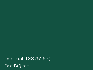 Decimal 18876165 Color is a very dark cyan color and the nearest color is Brunswick Green #1b4d3e. Hex code #125241 and RGB value is rgb(18,82,65). In RGB color space, this color is composed of 7% red, 32% green, 25% blue, In CMYK color space, this color is composed of 78% cyan, 0% magenta, 21% yellow , 68% black , In HSL color space, this color has a hue angle of 164° , 64% saturation and 20% lightness.