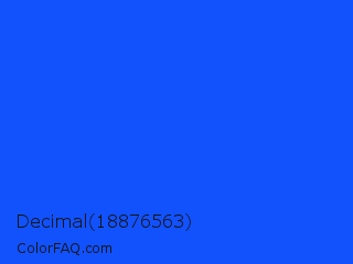 Decimal 18876563 Color is a normal blue color and the nearest color is Blue RYB #0247fe. Hex code #1252fd and RGB value is rgb(18,82,253). In RGB color space, this color is composed of 7% red, 32% green, 99% blue, In CMYK color space, this color is composed of 93% cyan, 68% magenta, 0% yellow , 1% black , In HSL color space, this color has a hue angle of 224° , 98% saturation and 53% lightness.