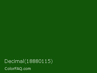 Decimal 18880115 Color is a very dark green color and the nearest color is Lincoln Green #195905. Hex code #125609 and RGB value is rgb(18,86,9). In RGB color space, this color is composed of 7% red, 34% green, 4% blue, In CMYK color space, this color is composed of 79% cyan, 0% magenta, 90% yellow , 66% black , In HSL color space, this color has a hue angle of 113° , 81% saturation and 19% lightness.