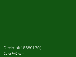 Decimal 18880130 Color is a very dark green color and the nearest color is Parsley #134f19. Hex code #125612 and RGB value is rgb(18,86,18). In RGB color space, this color is composed of 7% red, 34% green, 7% blue, In CMYK color space, this color is composed of 79% cyan, 0% magenta, 79% yellow , 66% black , In HSL color space, this color has a hue angle of 120° , 65% saturation and 20% lightness.