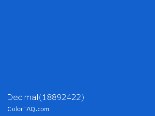 Decimal 18892422 Color is a normal blue color and the nearest color is Denim #1560bd. Hex code #1261ce and RGB value is rgb(18,97,206). In RGB color space, this color is composed of 7% red, 38% green, 81% blue, In CMYK color space, this color is composed of 91% cyan, 53% magenta, 0% yellow , 19% black , In HSL color space, this color has a hue angle of 215° , 84% saturation and 44% lightness.