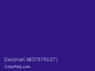 Decimal 4837679107 Color is a dark indigo color and the nearest color is Pixie Powder #391285. Hex code #301683 and RGB value is rgb(48,22,131). In RGB color space, this color is composed of 19% red, 9% green, 51% blue, In CMYK color space, this color is composed of 63% cyan, 83% magenta, 0% yellow , 49% black , In HSL color space, this color has a hue angle of 254° , 71% saturation and 30% lightness.