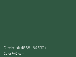 Decimal 4838164532 Color is a dark green color and the nearest color is Hunter Green #355e3b. Hex code #305842 and RGB value is rgb(48,88,66). In RGB color space, this color is composed of 19% red, 35% green, 26% blue, In CMYK color space, this color is composed of 45% cyan, 0% magenta, 25% yellow , 65% black , In HSL color space, this color has a hue angle of 147° , 29% saturation and 27% lightness.