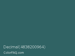 Decimal 4838200964 Color is a dark cyan color and the nearest color is Casal #2f6168. Hex code #306364 and RGB value is rgb(48,99,100). In RGB color space, this color is composed of 19% red, 39% green, 39% blue, In CMYK color space, this color is composed of 52% cyan, 1% magenta, 0% yellow , 61% black , In HSL color space, this color has a hue angle of 181° , 35% saturation and 29% lightness.