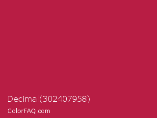 Decimal 302407958 Color is a normal red color and the nearest color is French Wine #ac1e44. Hex code #b81d44 and RGB value is rgb(184,29,68). In RGB color space, this color is composed of 72% red, 11% green, 27% blue, In CMYK color space, this color is composed of 0% cyan, 84% magenta, 63% yellow , 28% black , In HSL color space, this color has a hue angle of 345° , 73% saturation and 42% lightness.