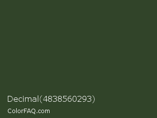 Decimal 4838560293 Color is a very dark green color and the nearest color is Kombu Green #354230. Hex code #314429 and RGB value is rgb(49,68,41). In RGB color space, this color is composed of 19% red, 27% green, 16% blue, In CMYK color space, this color is composed of 28% cyan, 0% magenta, 40% yellow , 73% black , In HSL color space, this color has a hue angle of 102° , 25% saturation and 21% lightness.