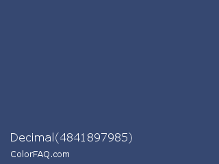 Decimal 4841897985 Color is a normal blue color and the nearest color is San Juan #304b6a. Hex code #364871 and RGB value is rgb(54,72,113). In RGB color space, this color is composed of 21% red, 28% green, 44% blue, In CMYK color space, this color is composed of 52% cyan, 36% magenta, 0% yellow , 56% black , In HSL color space, this color has a hue angle of 222° , 35% saturation and 33% lightness.