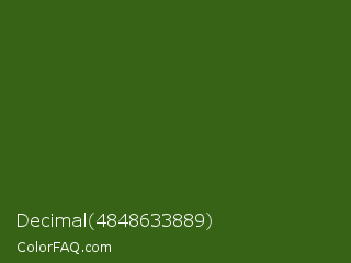 Decimal 4848633889 Color is a dark green color and the nearest color is Dell #396413. Hex code #366315 and RGB value is rgb(54,99,21). In RGB color space, this color is composed of 21% red, 39% green, 8% blue, In CMYK color space, this color is composed of 45% cyan, 0% magenta, 79% yellow , 61% black , In HSL color space, this color has a hue angle of 95° , 65% saturation and 24% lightness.