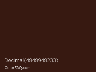 Decimal 4848948233 Color is a very dark red color and the nearest color is Tamarind #341515. Hex code #371911 and RGB value is rgb(55,25,17). In RGB color space, this color is composed of 22% red, 10% green, 7% blue, In CMYK color space, this color is composed of 0% cyan, 55% magenta, 69% yellow , 78% black , In HSL color space, this color has a hue angle of 13° , 53% saturation and 14% lightness.