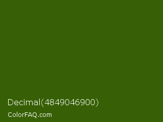 Decimal 4849046900 Color is a very dark green color and the nearest color is Dell #396413. Hex code #376006 and RGB value is rgb(55,96,6). In RGB color space, this color is composed of 22% red, 38% green, 2% blue, In CMYK color space, this color is composed of 43% cyan, 0% magenta, 94% yellow , 62% black , In HSL color space, this color has a hue angle of 87° , 88% saturation and 20% lightness.