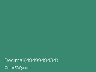 Decimal 4849948434 Color is a normal green color and the nearest color is Viridian #40826d. Hex code #388970 and RGB value is rgb(56,137,112). In RGB color space, this color is composed of 22% red, 54% green, 44% blue, In CMYK color space, this color is composed of 59% cyan, 0% magenta, 18% yellow , 46% black , In HSL color space, this color has a hue angle of 161° , 42% saturation and 38% lightness.