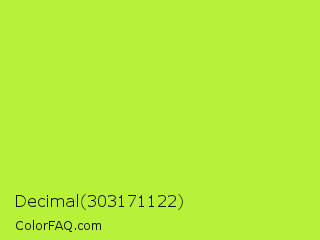 Decimal 303171122 Color is a normal lime color and the nearest color is Green Lizard #a7f432. Hex code #b8f238 and RGB value is rgb(184,242,56). In RGB color space, this color is composed of 72% red, 95% green, 22% blue, In CMYK color space, this color is composed of 24% cyan, 0% magenta, 77% yellow , 5% black , In HSL color space, this color has a hue angle of 79° , 88% saturation and 58% lightness.