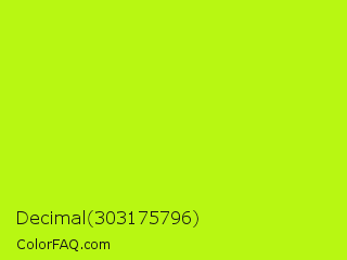 Decimal 303175796 Color is a normal lime color and the nearest color is Lime #bfff00. Hex code #b8f712 and RGB value is rgb(184,247,18). In RGB color space, this color is composed of 72% red, 97% green, 7% blue, In CMYK color space, this color is composed of 26% cyan, 0% magenta, 93% yellow , 3% black , In HSL color space, this color has a hue angle of 77° , 93% saturation and 52% lightness.