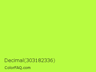 Decimal 303182336 Color is a light green color and the nearest color is Green Yellow #adff2f. Hex code #b8fc40 and RGB value is rgb(184,252,64). In RGB color space, this color is composed of 72% red, 99% green, 25% blue, In CMYK color space, this color is composed of 27% cyan, 0% magenta, 75% yellow , 1% black , In HSL color space, this color has a hue angle of 82° , 97% saturation and 62% lightness.