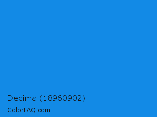 Decimal 18960902 Color is a normal blue color and the nearest color is Rich Electric Blue #0892d0. Hex code #128ae6 and RGB value is rgb(18,138,230). In RGB color space, this color is composed of 7% red, 54% green, 90% blue, In CMYK color space, this color is composed of 92% cyan, 40% magenta, 0% yellow , 10% black , In HSL color space, this color has a hue angle of 206° , 85% saturation and 49% lightness.
