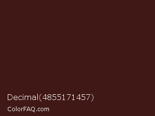Decimal 4855171457 Color is a very dark red color and the nearest color is Cedar #3e1c14. Hex code #401815 and RGB value is rgb(64,24,21). In RGB color space, this color is composed of 25% red, 9% green, 8% blue, In CMYK color space, this color is composed of 0% cyan, 63% magenta, 67% yellow , 75% black , In HSL color space, this color has a hue angle of 4° , 51% saturation and 17% lightness.