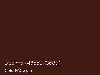 Decimal 4855173687 Color is a very dark red color and the nearest color is Cedar #3e1c14. Hex code #401915 and RGB value is rgb(64,25,21). In RGB color space, this color is composed of 25% red, 10% green, 8% blue, In CMYK color space, this color is composed of 0% cyan, 61% magenta, 67% yellow , 75% black , In HSL color space, this color has a hue angle of 6° , 51% saturation and 17% lightness.