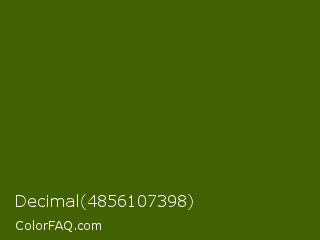 Decimal 4856107398 Color is a very dark green color and the nearest color is Green Leaf #436a0d. Hex code #416102 and RGB value is rgb(65,97,2). In RGB color space, this color is composed of 25% red, 38% green, 1% blue, In CMYK color space, this color is composed of 33% cyan, 0% magenta, 98% yellow , 62% black , In HSL color space, this color has a hue angle of 80° , 96% saturation and 19% lightness.