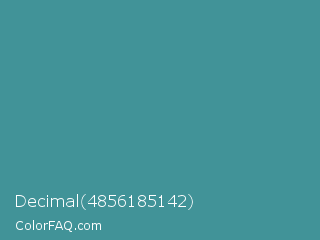 Decimal 4856185142 Color is a normal cyan color and the nearest color is Zomp #39a78e. Hex code #419398 and RGB value is rgb(65,147,152). In RGB color space, this color is composed of 25% red, 58% green, 60% blue, In CMYK color space, this color is composed of 57% cyan, 3% magenta, 0% yellow , 40% black , In HSL color space, this color has a hue angle of 183° , 40% saturation and 43% lightness.