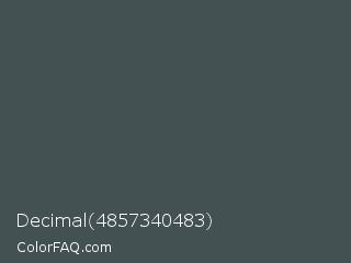 Decimal 4857340483 Color is a dark cyan color and the nearest color is River Bed #434c59. Hex code #435153 and RGB value is rgb(67,81,83). In RGB color space, this color is composed of 26% red, 32% green, 33% blue, In CMYK color space, this color is composed of 19% cyan, 2% magenta, 0% yellow , 67% black , In HSL color space, this color has a hue angle of 188° , 11% saturation and 29% lightness.