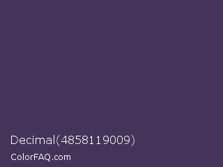 Decimal 4858119009 Color is a dark violet color and the nearest color is Bossanova #4e2a5a. Hex code #443459 and RGB value is rgb(68,52,89). In RGB color space, this color is composed of 27% red, 20% green, 35% blue, In CMYK color space, this color is composed of 24% cyan, 42% magenta, 0% yellow , 65% black , In HSL color space, this color has a hue angle of 266° , 26% saturation and 28% lightness.