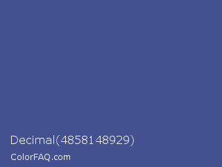 Decimal 4858148929 Color is a normal blue color and the nearest color is Chambray #354e8c. Hex code #445191 and RGB value is rgb(68,81,145). In RGB color space, this color is composed of 27% red, 32% green, 57% blue, In CMYK color space, this color is composed of 53% cyan, 44% magenta, 0% yellow , 43% black , In HSL color space, this color has a hue angle of 230° , 36% saturation and 42% lightness.