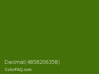 Decimal 4858206358 Color is a dark green color and the nearest color is Green Leaf #436a0d. Hex code #447108 and RGB value is rgb(68,113,8). In RGB color space, this color is composed of 27% red, 44% green, 3% blue, In CMYK color space, this color is composed of 40% cyan, 0% magenta, 93% yellow , 56% black , In HSL color space, this color has a hue angle of 86° , 87% saturation and 24% lightness.