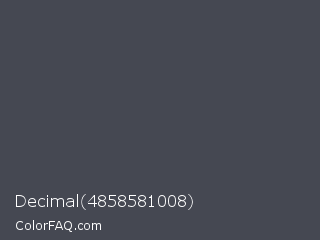 Decimal 4858581008 Color is a dark blue color and the nearest color is Mako #444954. Hex code #454852 and RGB value is rgb(69,72,82). In RGB color space, this color is composed of 27% red, 28% green, 32% blue, In CMYK color space, this color is composed of 16% cyan, 12% magenta, 0% yellow , 68% black , In HSL color space, this color has a hue angle of 226° , 9% saturation and 30% lightness.