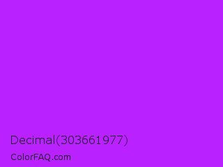 Decimal 303661977 Color is a normal purple color and the nearest color is Veronica #a020f0. Hex code #ba21ff and RGB value is rgb(186,33,255). In RGB color space, this color is composed of 73% red, 13% green, 100% blue, In CMYK color space, this color is composed of 27% cyan, 87% magenta, 0% yellow , 0% black , In HSL color space, this color has a hue angle of 281° , 100% saturation and 56% lightness.