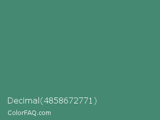 Decimal 4858672771 Color is a normal green color and the nearest color is Viridian #40826d. Hex code #458973 and RGB value is rgb(69,137,115). In RGB color space, this color is composed of 27% red, 54% green, 45% blue, In CMYK color space, this color is composed of 50% cyan, 0% magenta, 16% yellow , 46% black , In HSL color space, this color has a hue angle of 161° , 33% saturation and 40% lightness.