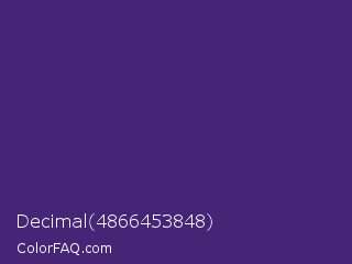 Decimal 4866453848 Color is a dark violet color and the nearest color is Meteorite #3c1f76. Hex code #472576 and RGB value is rgb(71,37,118). In RGB color space, this color is composed of 28% red, 15% green, 46% blue, In CMYK color space, this color is composed of 40% cyan, 69% magenta, 0% yellow , 54% black , In HSL color space, this color has a hue angle of 265° , 52% saturation and 30% lightness.