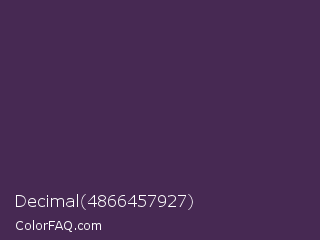 Decimal 4866457927 Color is a dark purple color and the nearest color is Bossanova #4e2a5a. Hex code #472953 and RGB value is rgb(71,41,83). In RGB color space, this color is composed of 28% red, 16% green, 33% blue, In CMYK color space, this color is composed of 14% cyan, 51% magenta, 0% yellow , 67% black , In HSL color space, this color has a hue angle of 283° , 34% saturation and 24% lightness.