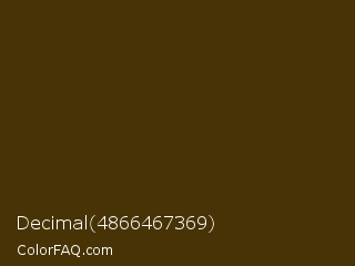 Decimal 4866467369 Color is a very dark orange color and the nearest color is Deep Bronze #4a3004. Hex code #473305 and RGB value is rgb(71,51,5). In RGB color space, this color is composed of 28% red, 20% green, 2% blue, In CMYK color space, this color is composed of 0% cyan, 28% magenta, 93% yellow , 72% black , In HSL color space, this color has a hue angle of 42° , 87% saturation and 15% lightness.