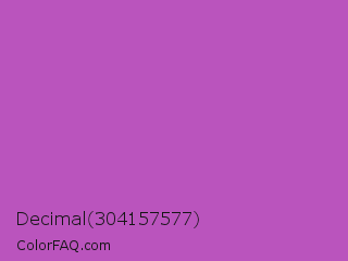 Decimal 304157577 Color is a normal magenta color and the nearest color is Fuchsia Pink #c154c1. Hex code #ba54bd and RGB value is rgb(186,84,189). In RGB color space, this color is composed of 73% red, 33% green, 74% blue, In CMYK color space, this color is composed of 2% cyan, 56% magenta, 0% yellow , 26% black , In HSL color space, this color has a hue angle of 298° , 44% saturation and 54% lightness.