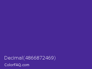 Decimal 4866872469 Color is a normal indigo color and the nearest color is Daisy Bush #4f2398. Hex code #482897 and RGB value is rgb(72,40,151). In RGB color space, this color is composed of 28% red, 16% green, 59% blue, In CMYK color space, this color is composed of 52% cyan, 74% magenta, 0% yellow , 41% black , In HSL color space, this color has a hue angle of 257° , 58% saturation and 37% lightness.