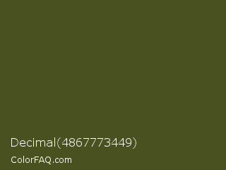 Decimal 4867773449 Color is a very dark yellow color and the nearest color is Army Green #4b5320. Hex code #495121 and RGB value is rgb(73,81,33). In RGB color space, this color is composed of 29% red, 32% green, 13% blue, In CMYK color space, this color is composed of 10% cyan, 0% magenta, 59% yellow , 68% black , In HSL color space, this color has a hue angle of 70° , 42% saturation and 22% lightness.