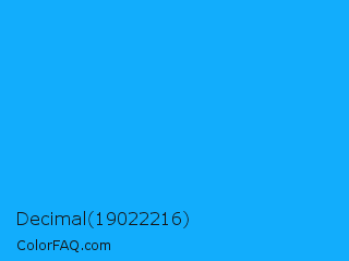 Decimal 19022216 Color is a normal blue color and the nearest color is Spiro Disco Ball #0fc0fc. Hex code #12adfc and RGB value is rgb(18,173,252). In RGB color space, this color is composed of 7% red, 68% green, 99% blue, In CMYK color space, this color is composed of 93% cyan, 31% magenta, 0% yellow , 1% black , In HSL color space, this color has a hue angle of 200° , 98% saturation and 53% lightness.