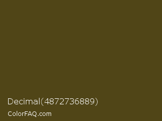 Decimal 4872736889 Color is a very dark yellow color and the nearest color is Punga #4d3d14. Hex code #504517 and RGB value is rgb(80,69,23). In RGB color space, this color is composed of 31% red, 27% green, 9% blue, In CMYK color space, this color is composed of 0% cyan, 14% magenta, 71% yellow , 69% black , In HSL color space, this color has a hue angle of 48° , 55% saturation and 20% lightness.