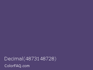 Decimal 4873148728 Color is a normal indigo color and the nearest color is Cyber Grape #58427c. Hex code #514272 and RGB value is rgb(81,66,114). In RGB color space, this color is composed of 32% red, 26% green, 45% blue, In CMYK color space, this color is composed of 29% cyan, 42% magenta, 0% yellow , 55% black , In HSL color space, this color has a hue angle of 259° , 27% saturation and 35% lightness.