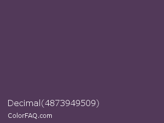 Decimal 4873949509 Color is a dark purple color and the nearest color is English Violet #563c5c. Hex code #523959 and RGB value is rgb(82,57,89). In RGB color space, this color is composed of 32% red, 22% green, 35% blue, In CMYK color space, this color is composed of 8% cyan, 36% magenta, 0% yellow , 65% black , In HSL color space, this color has a hue angle of 287° , 22% saturation and 29% lightness.