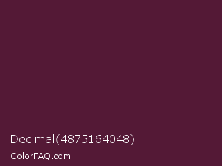 Decimal 4875164048 Color is a very dark rose color and the nearest color is Wine Berry #591d35. Hex code #541936 and RGB value is rgb(84,25,54). In RGB color space, this color is composed of 33% red, 10% green, 21% blue, In CMYK color space, this color is composed of 0% cyan, 70% magenta, 36% yellow , 67% black , In HSL color space, this color has a hue angle of 331° , 54% saturation and 21% lightness.