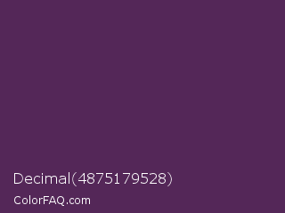 Decimal 4875179528 Color is a dark magenta color and the nearest color is Bossanova #4e2a5a. Hex code #542758 and RGB value is rgb(84,39,88). In RGB color space, this color is composed of 33% red, 15% green, 35% blue, In CMYK color space, this color is composed of 5% cyan, 56% magenta, 0% yellow , 65% black , In HSL color space, this color has a hue angle of 295° , 39% saturation and 25% lightness.