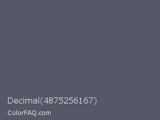 Decimal 4875256167 Color is a normal blue color and the nearest color is Scarpa Flow #585562. Hex code #545867 and RGB value is rgb(84,88,103). In RGB color space, this color is composed of 33% red, 35% green, 40% blue, In CMYK color space, this color is composed of 18% cyan, 15% magenta, 0% yellow , 60% black , In HSL color space, this color has a hue angle of 227° , 10% saturation and 37% lightness.