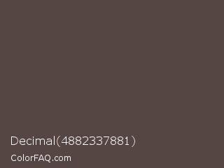 Decimal 4882337881 Color is a dark red color and the nearest color is Emperor #514649. Hex code #554643 and RGB value is rgb(85,70,67). In RGB color space, this color is composed of 33% red, 27% green, 26% blue, In CMYK color space, this color is composed of 0% cyan, 18% magenta, 21% yellow , 67% black , In HSL color space, this color has a hue angle of 10° , 12% saturation and 30% lightness.